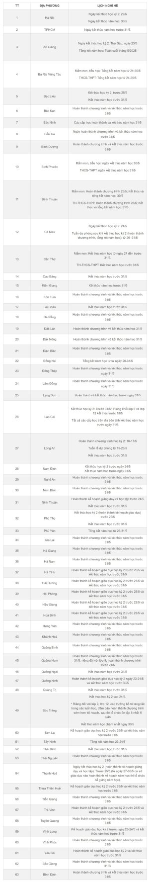Lịch nghỉ hè chính thức của học sinh ở 63 tỉnh thành cụ thể như sau: