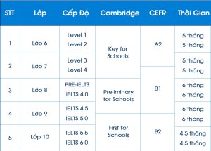 • Chương trình Level 1 - 3: Bổ sung vốn từ vựng học thuật. Trang bị các kỹ năng, chiến lược làm bài một cách cơ bản nhất. Chuẩn bị cho học viên một nền tảng kiến thức vững chắc, bổ trợ những kỹ năng còn thiếu. Sau khóa học, học viên sẽ hoàn toàn tự tin để phát huy tối đa những kiến thức lớp IELTS mang lại. • Chương trình Level 4 - IELTS 4.5: Bổ sung đầy đủ 4 kỹ năng, đặc biệt là vốn từ vựng học thuật. Học sinh ở trình độ này có thể đọc sách báo bằng tiếng Anh đơn giản. Viết thư và email về các chủ đề hàng ngày. Hiểu rõ các thông tin thực tế. Thể hiện nhận thức về quan điểm và tâm trạng trong văn nói và viết tiếng Anh. • Chương trình IELTS 5.0 - IELTS 6.0: Bổ sung đầy đủ 4 kỹ năng, đặc biệt là vốn từ vụng học thuật. Tập phản xạ nói trong việc trả lời các câu hỏi Speaking học phát âm và sửa phát âm rất kỹ. Thực hành thành thạo viết từ mệnh đề, câu đơn, câu phức để hoàn thành một bài academic paragraph, phân tích biểu đồ, viết luận đúng form tiêu chuẩn của IELTS.