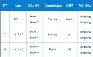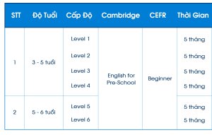 • Chương trình cho lớp 1 - 2: Học sinh có thể nghe hiểu được các yêu cầu đơn giản của giáo viên ngay tại lớp học, hình thành hứng thú học Tiếng Anh. Đọc hiểu được các văn bản tiếng Anh chứa từ vựng cơ bản kèm theo tranh vbex như truyện tranh. Phân tích và trả lời các câu hỏi dạng điền thông tin.