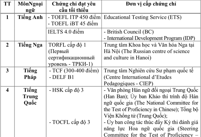 Thí sinh có một trong các chứng chỉ ngoại ngữ (giống hoặc khác với môn ngoại ngữ đang học tại trường phổ thông) hợp lệ, có giá trị sử dụng ít nhất đến ngày 27.6 và đạt mức điểm tối thiểu theo bảng dưới đây: